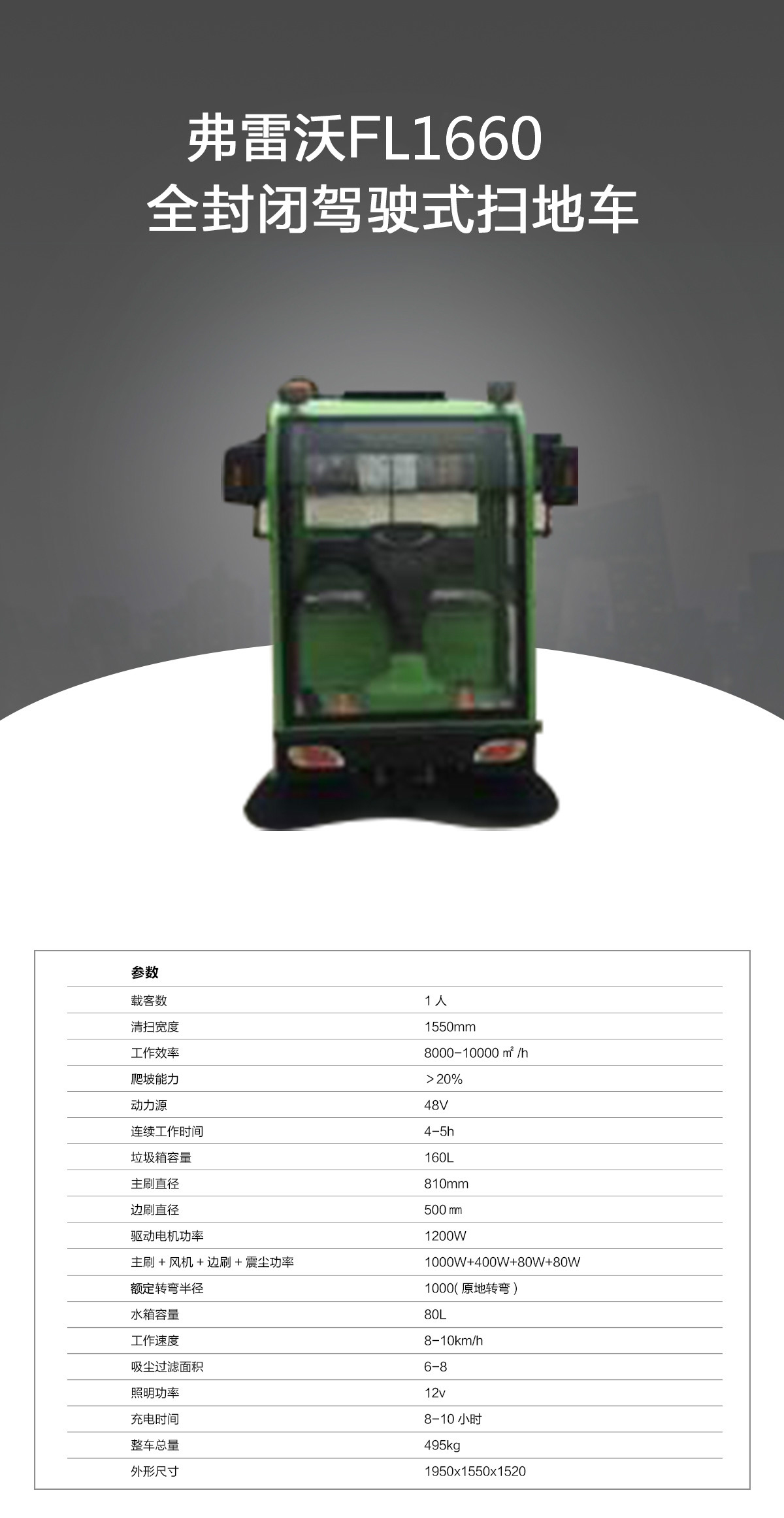 產(chǎn)品分類:駕駛式掃地機(jī)產(chǎn)品特點(diǎn):1、全封閉駕駛式掃地機(jī)1660特有出口型免維護(hù)電瓶,區(qū)別于市面上其他電動(dòng)掃地機(jī),其智能型充電機(jī)能有效延長電瓶使用壽命,可使連續(xù)工作時(shí)間更長。2、全封閉設(shè)計(jì)保護(hù)工作人員身心健康。3、底部主刷和兩側(cè)邊刷可自由調(diào)節(jié)高度使清掃效率更高,清掃寬度達(dá)到1550mm,完成1000㎡的地面清掃工作僅需6分鐘,比傳統(tǒng)人力清掃效率提高幾十倍,并且還能節(jié)省人力成本,省時(shí)省力、更省錢!4、控制面板友好,操作簡單、易懂,使用前工作人員無需特別培訓(xùn),“保潔大媽也能輕松操作完成清掃任務(wù)”。5、配備的優(yōu)良吸塵系統(tǒng)能夠有效抑制揚(yáng)塵的產(chǎn)生,避免二次污染。適用環(huán)境:車站、機(jī)場(chǎng)、物業(yè)小區(qū)、倉庫、車間、園區(qū)、廣場(chǎng)、學(xué)校、醫(yī)院、商場(chǎng)、公園、市政單位、街道等公共場(chǎng)所地面。